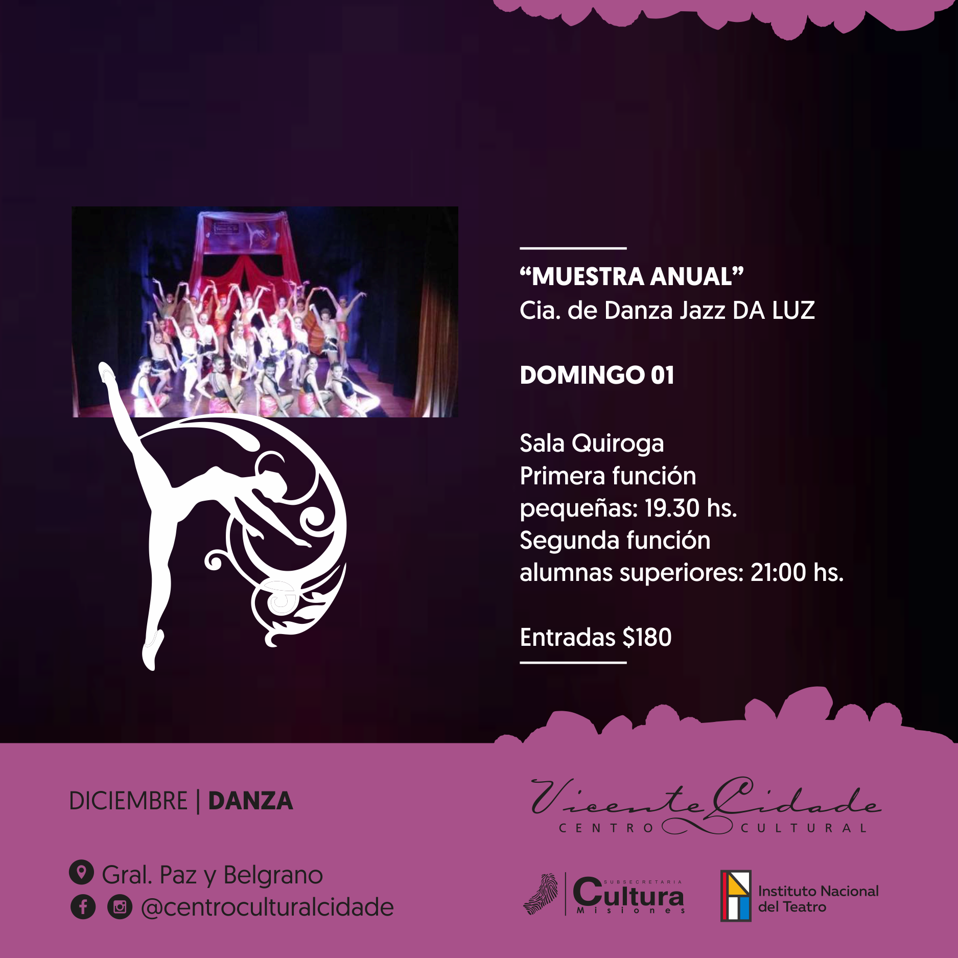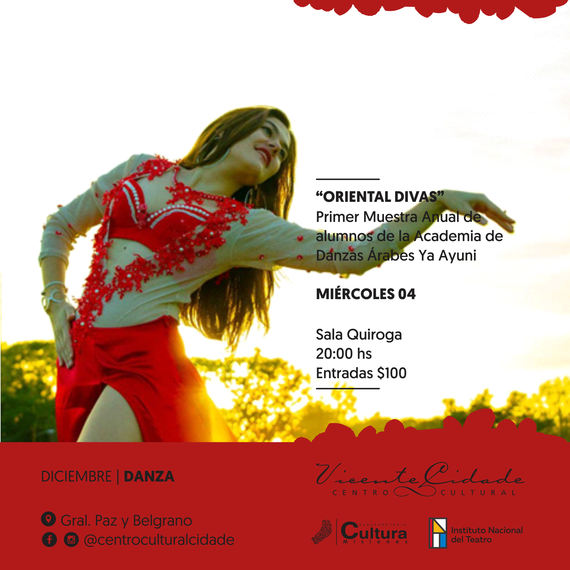 Noche de gala en el Cidade: El domingo 15 de diciembre a las 20:00 horas en la Sala Quiroga del Centro Cultural Cidade se llevará a cabo la gala examen del instituto Shazadi a cargo de la profesora Patricia Guerrero.