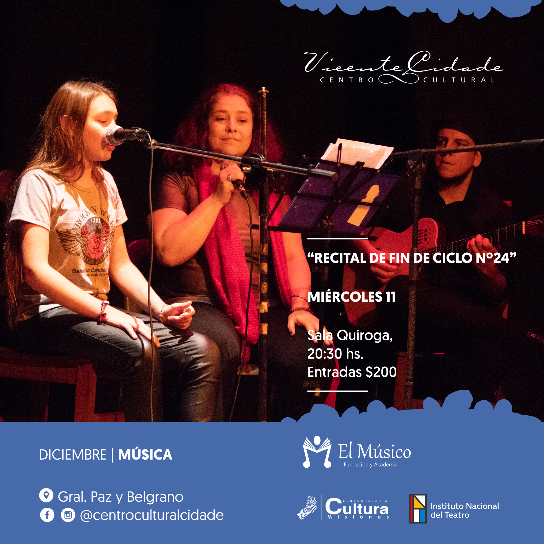 El miércoles 11 de diciembre a las 20:30 horas en la Sala Quiroga del Centro cultural Cidade la Fundación y Academia El Músico realizará el recital de fin de ciclo nº24, en el cual alumnos y profesores de la academia cantarán y tocarán instrumentos.