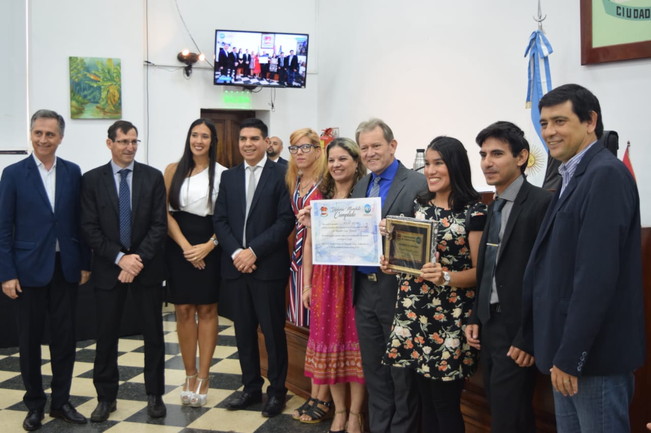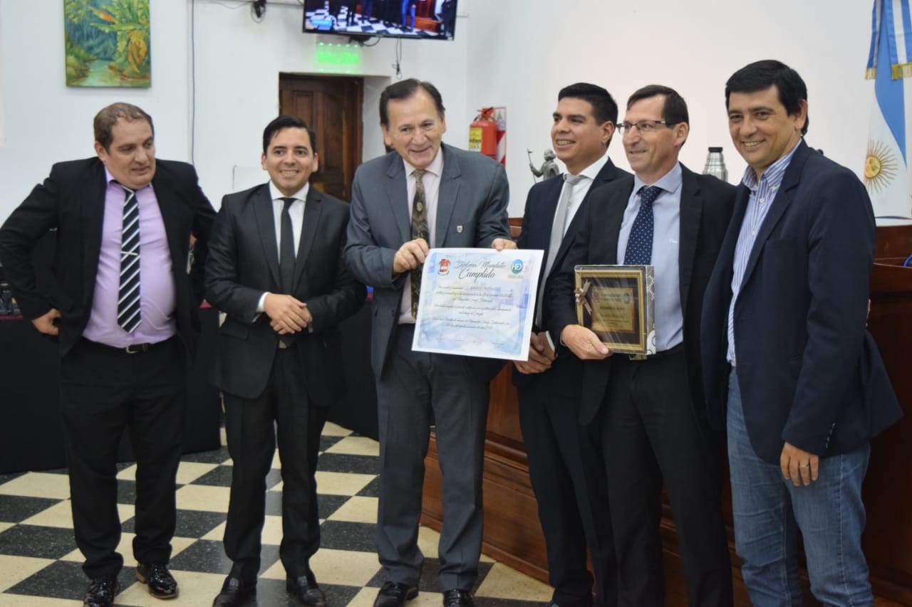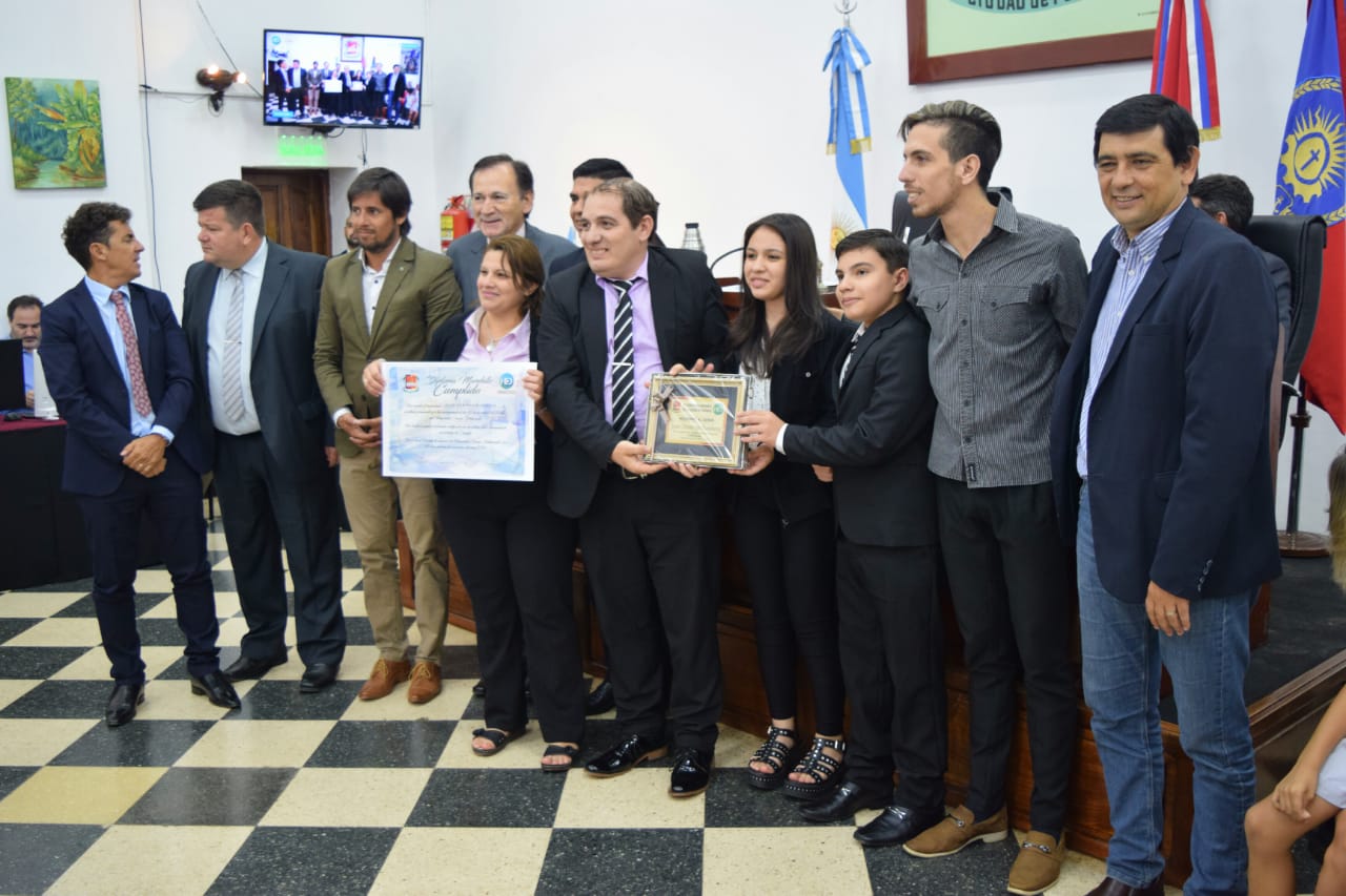 El presidente del HCD, Fernando Meza junto al intendente de la ciudad, Joaquín Losada, entregaron las distinciones a los ediles mandato cumplido, quienes acudieron a recibirlos con sus afectos presentes. Al finalizar la sesión, agradecieron a sus pares y equipos de trabajo por el acompañamiento durante todos estos años.