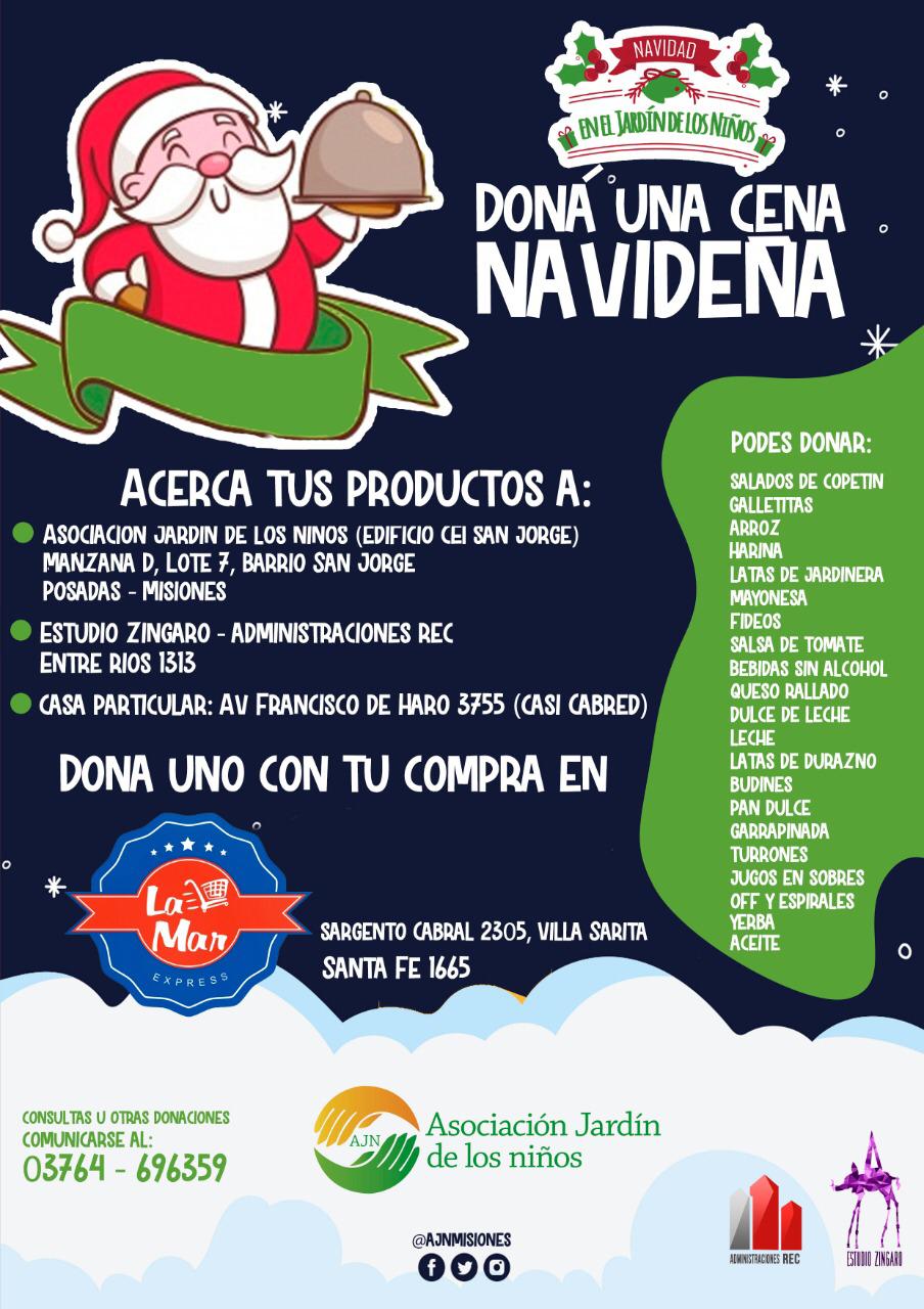 En esta oportunidad, la Asociación Jardín de los Niños (AJN) trabajará en conjunto con empresas e instituciones del sector privado que han ofrecido sus establecimientos como puntos de acopio de las donaciones. Podes acercar productos para la cena navideña en AJN (Manzana D, Lote 7, barrio San Jorge), en Estudio Zingaro (Entre Ríos 1313) o a un domicilio particular (Av. Francisco de Haro 3755 casi Cabred). También, comprando en el supermercado “La Mar” (Sargento Cabral 2305 o Santa Fé 1665) podés donar un producto de los detallados en el lugar y así muchas familias podrán tener alimentos sustanciosos en estas fiestas.
