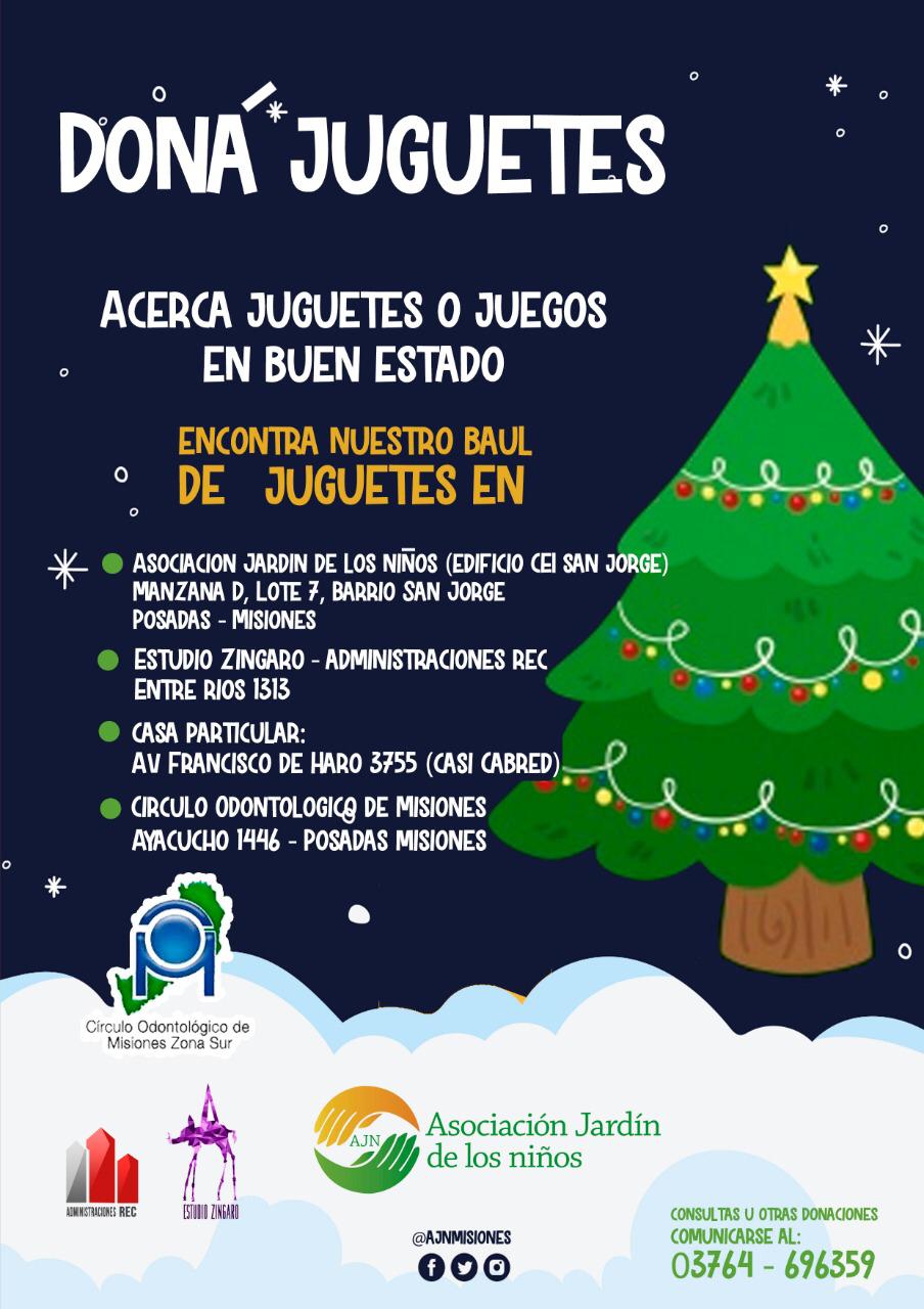 Los juguetes o juegos en buen estado, podrán depositarse en los baúles que encontrarán en AJN (Manzana D, Lote 7, barrio San Jorge), en Estudio Zingaro (Entre Ríos 1313), en domicilio particular (Av. Francisco de Haro 3755 casi Cabred) o en el Círculo Odontológico de Misiones (Ayacucho 1446).
