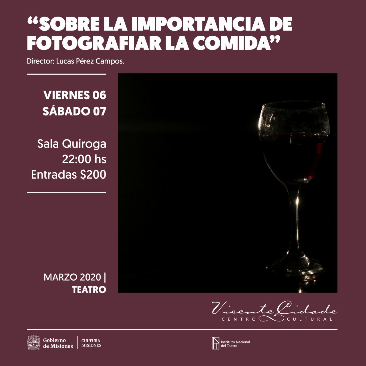Este viernes 6 y sábado 7 de marzo en la Sala Quiroga del Centro Cultural Vicente Cidade (Belgrano y General Paz) a partir de las 22:00 hs saldrá a escena la Obra “Sobre la importancia de fotografiar la comida” del grupo de teatro Árbolesminí dirigido por Lucas Pérez Campos.