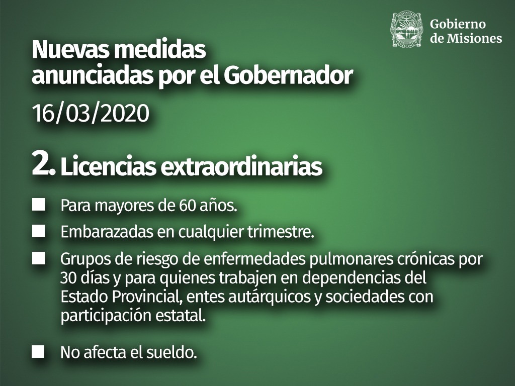 Además, el mandatario provincial anunció que “a todas las personas mayores de 60 años que trabajen en la administración pública provincial oficialmente se les va a otorgar una licencia extraordinaria por 30 día, sin que eso signifique la pérdida de su sueldo”. Aclaró que tendrán la posibilidad de cumplir tareas desde su domicilio y de manera online. “Esta licencia extraordinaria, además, se extiende a aquellas personas que tengan alguna enfermedad que predisponga a una inmunosupresión, alguna enfermedad que pueda hacer que su salud se debilite un poco más con estas patologías”, explicó Herrera Ahuad.