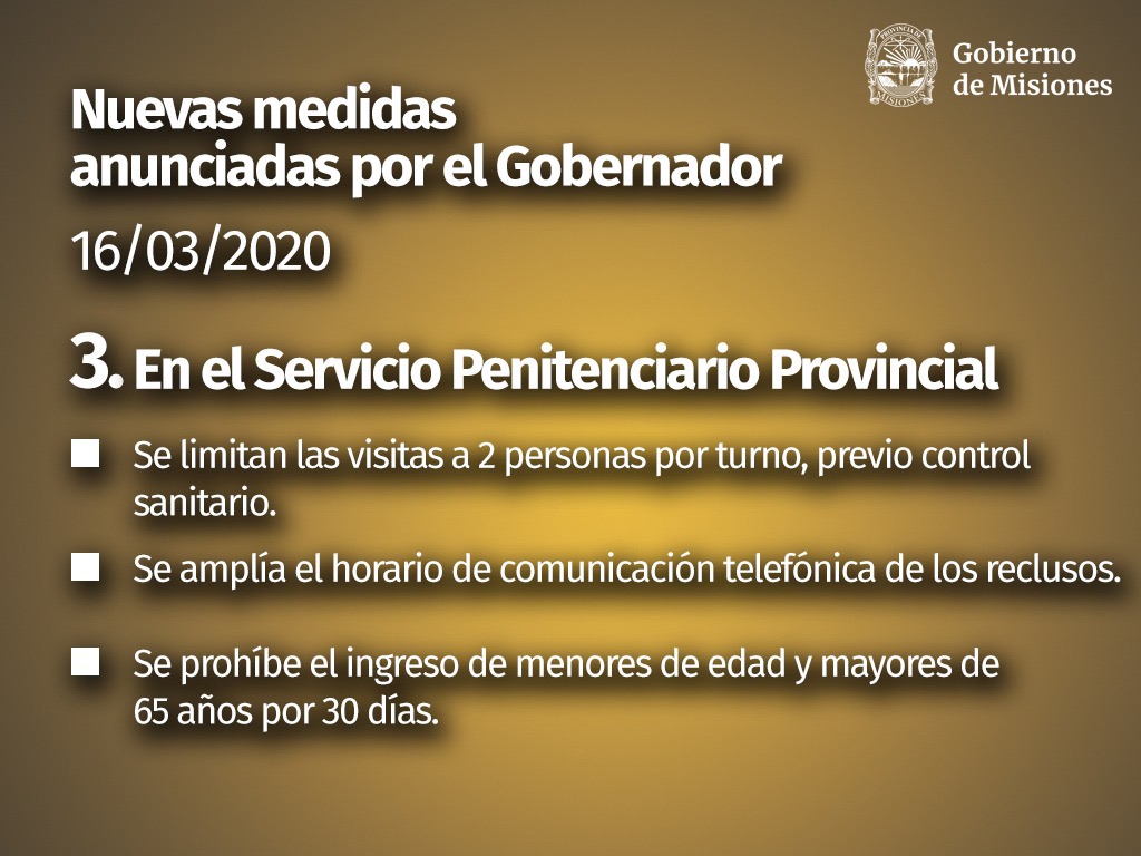 Otras medidas anunciadas esta mañana por el Gobernador se refieren al Servicio Penitencio Provincial. “A partir de ahora las visitas serán de no más de 2 personas, controladas por el servicio de sanidad antes del ingreso. Por otro lado, se va a ampliar el horario de comunicación telefónica de los reclusos. A esto se suma la prohibición del ingreso de menores de edad y de mayores de 65 años, por el término de treinta días.”