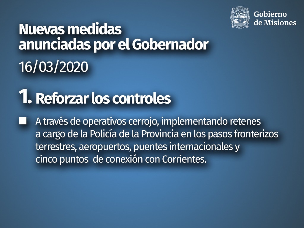 El gobernador comunicó esta mañana nuevas medidas en el marco de las acciones de control, prevención y concientización. En principio se implementarán, a través de la Policía de Misiones, operativos cerrojo con retenes en todos los ingresos que tiene la provincia. Esta medida implica operativos de la Policía misionera en pasos internacionales, aeropuertos, pasos fronterizos con Brasil y Paraguay y puntos de comunicación con la provincia de Corrientes. En los mismos se va a requerir documentación necesaria que permita certificar identidad y procedencia.