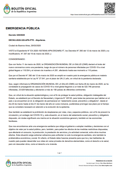 El gobierno funda ambos decretos (congelamiento de alquileres y suspensión de desalojos, y congelamiento de cuotas hipotecarias) en el marco de la “emergencia” y del decreto 297, que el 19 de marzo pasado dispuso el “aislamiento social, preventivo y obligatorio” para reducir la circulación del SARS-CoV-2, la variedad de coronavirus que provoca la enfermedad CoViD-19, que hoy pasó en el mundo el saldo de 30.000 muertes y en la Argentina lleva a la fecha un saldo de 745 casos confirmados de contagio y 19 muertos.