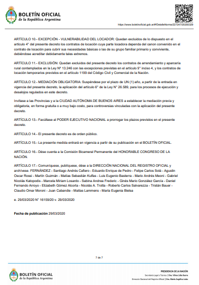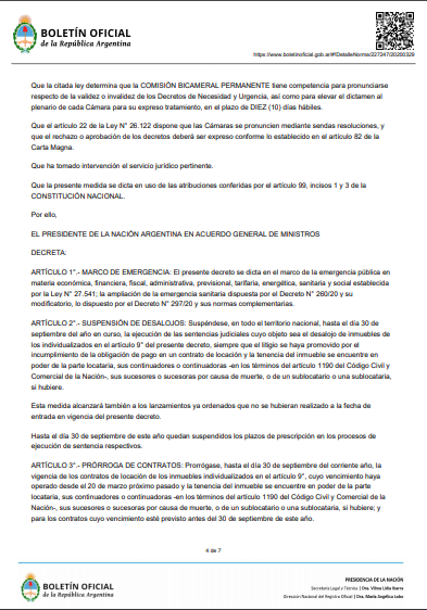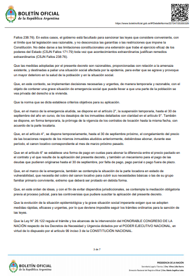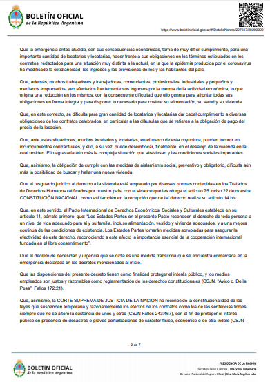 En sus considerandos, los decretos reconocen el alto impacto económico negativo de las medidas oficiales para limitar la expansión del virus y en cuanto a las nuevas medidas ratifica “el resguardo jurídico a la vivienda está amparado por las normas jurídicas internacionales, aplicables y aceptadas universalmente, en materia de DDHH” aunque a su vez reafirma “el reconocimiento del derecho a la vivienda, sino también la obligación estadual de tomar medidas apropiadas para asegurarlo” y la necesidad de llevar “alivio y tranquilidad a las familias que habitan el territorio nacional en un contexto de gran incertidumbre como el generado por la pandemia”.