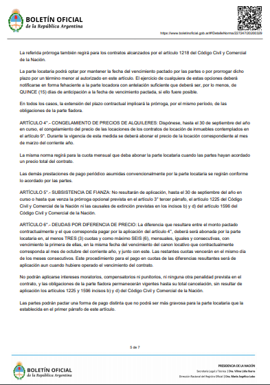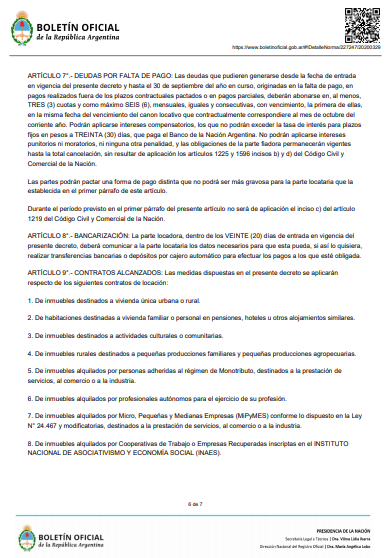 El artículo 9 del decreto explicita que el congelamiento alcanza a los contratos de locación de inmuebles destinados a vivienda única urbana y rural; habitaciones destinadas a vivienda familiar o personal en pensiones, hoteles u otros alojamientos; inmuebles destinados a actividades culturales o comunitarias; inmuebles rurales destinados a pequeñas producciones familiares y pequeñas producciones agropecuarias; inmuebles alquilados por monotributistas destinados a la prestación de servicios, al comercio o a la industria; inmuebles alquilados por profesionales autónomos para el ejercicio de su profesión; inmuebles alquilados por micro, pequeñas y medianas empresas; e inmuebles alquilados por cooperativas de trabajo y fábricas recuperadas.