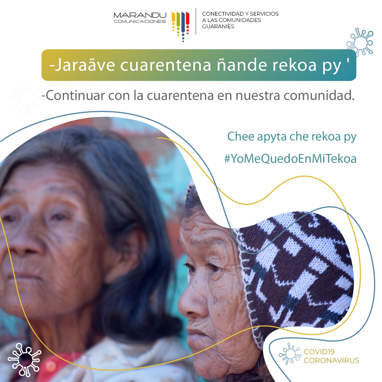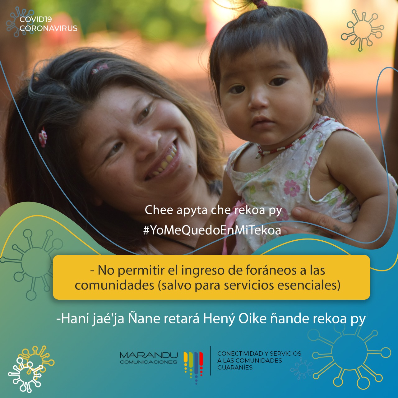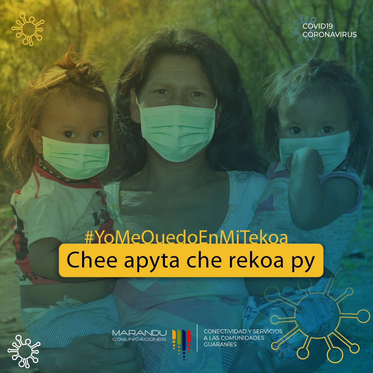 Bajo el lema “Yo me quedo en mi Tekeoa”, el Área de Conectividad y Servicios a Guaraníes de Marandú Comunicaciones lanzó una campaña de difusión y concientización con respecto los recaudos que las comunidades guaraníes deben tomar ante la pandemia del coronavirus.