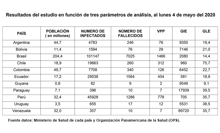 El equipo evaluó tres parámetros: la Velocidad de Propagación de la Pandemia (VPP); el Grupo de Sanos por Infección Específica (GIE), que mide la cantidad de población sana por cada infectado; y el Grupo de Curación por Letalidad Específica (GLE), que mide la cantidad de personas que sanan por cada persona que fallece a causa del COVID-19.