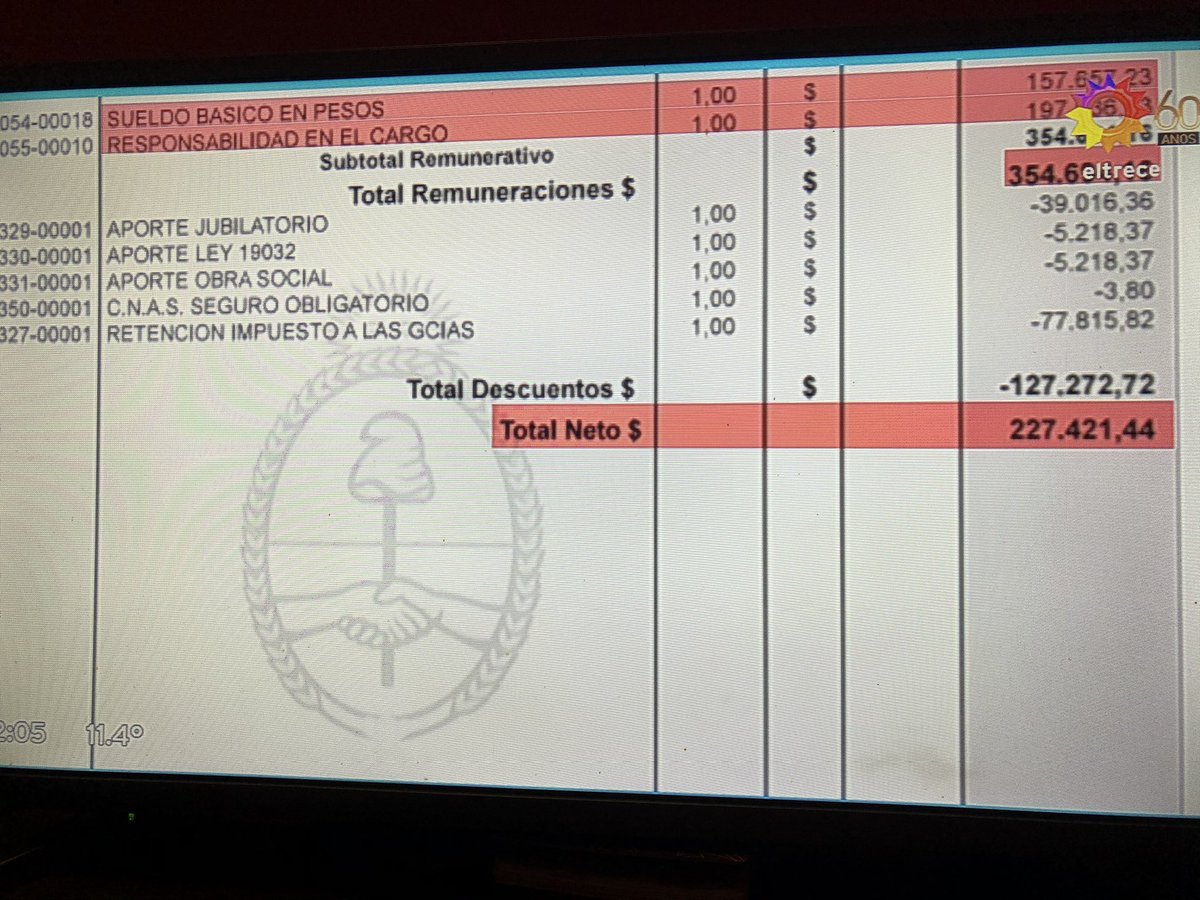 En esa línea, el periodista mostró recibos de sueldos de los políticos más importantes. “Supongamos que viven de su sueldo, el Presidente gana $354.694, con descuentos le queda en $230.000″.
