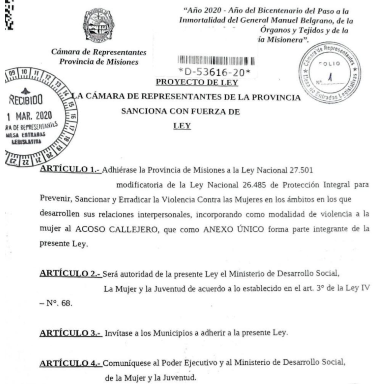 El proyecto presentado, que se dictaminó ayer en la Comisión de Niñez, Género y Familia de la Cámara de Representantes de Misiones propone adherir en la legislación provincial a la Ley Nacional 27.501 modificatoria de la Ley Nacional 26.485 de Protección Integral para Prevenir, Sancionar y Erradicar la Violencia Contra las Mujeres en los ámbitos en los que desarrollen sus relaciones interpersonales, incorporando como modalidad de violencia a la mujer al acoso callejero.