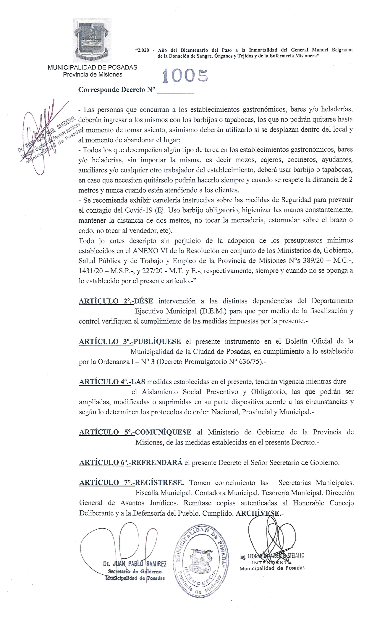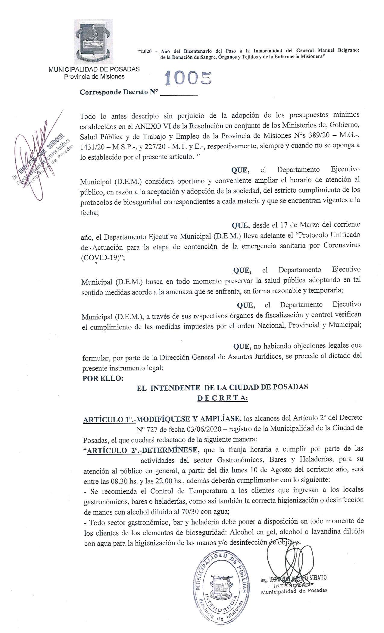 Por otra parte, mediante el Decreto 1007/20, la Municipalidad de Posadas habilitó nuevamente un horario excepcional para la atención al público de bares, restaurantes y heladerías durante los días viernes 07, sábado 08 y domingo 09 de agosto en el marco de la flexibilización de la cuarentena que rige en la capital provincial.