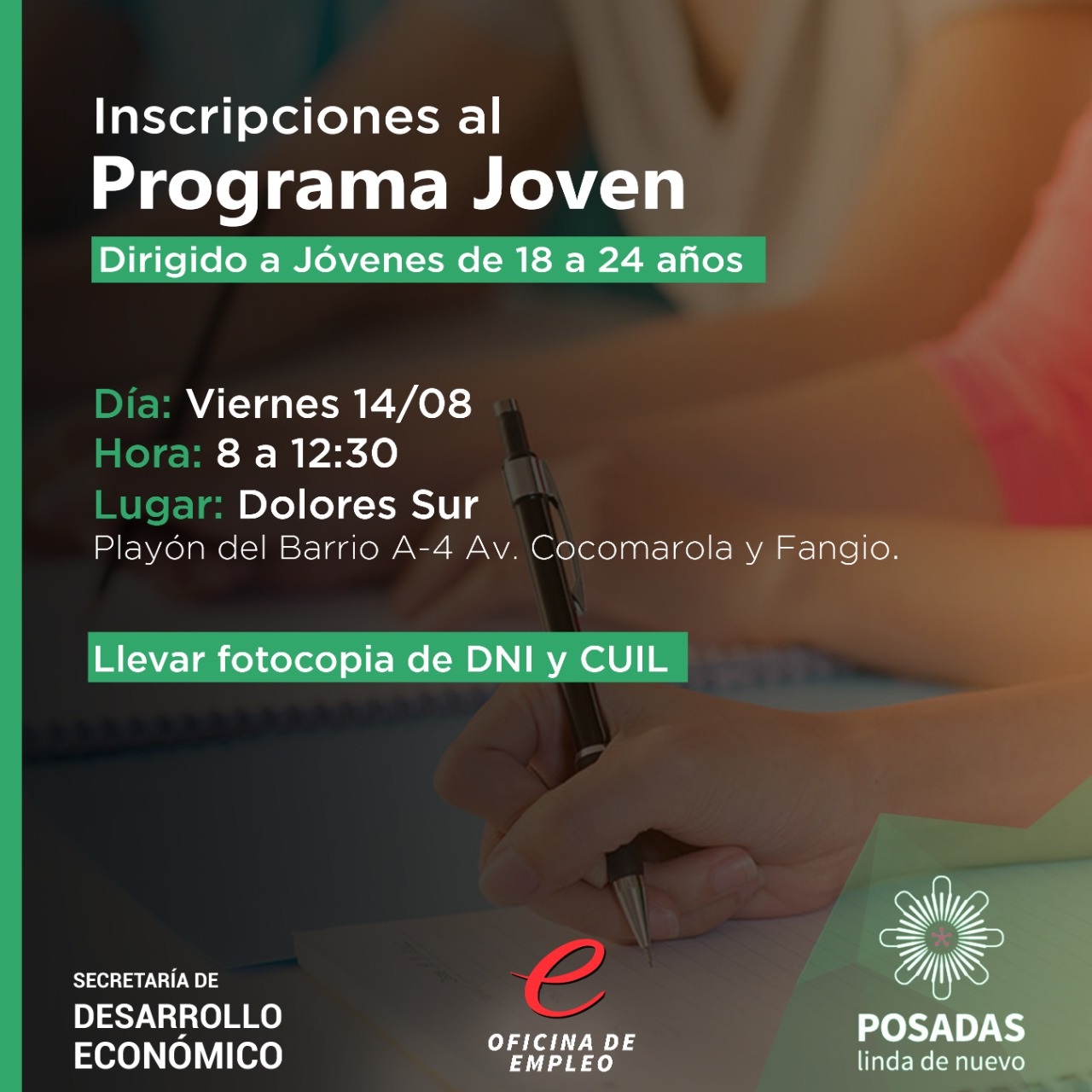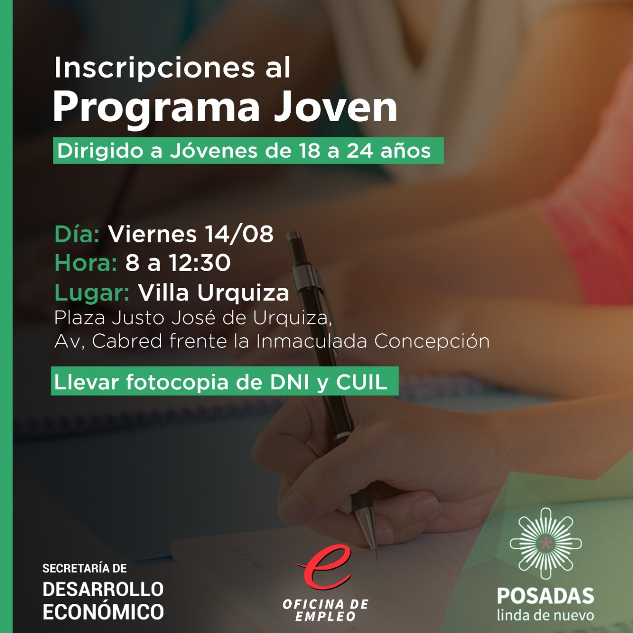 Este viernes las inscripciones continuarán en las Delegaciones Municipales de Villa Urquiza y Dolores Sur, de 08:00 a 12:30. La convocatoria está destinada a jóvenes entre 18 y 24 años que residan en Posadas, con estudios primarios o secundarios incompletos y que estén desempleados. Los interesados tendrán que llevar su DNI y constancia del CUIL, entre otros requisitos figuran que no deben ser beneficiarios del Progresar y deben residir permanentemente.
