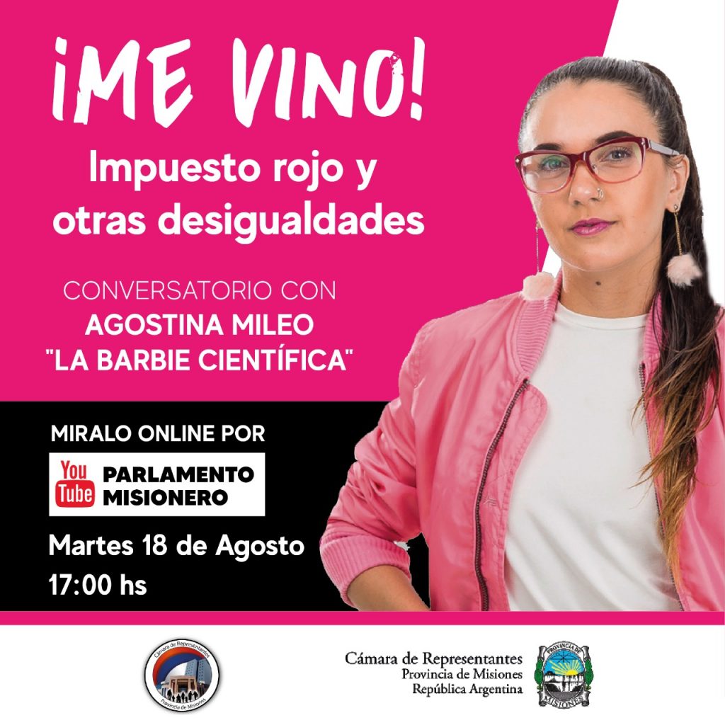 La Honorable Cámara de Representantes de Misiones invita al conversatorio online “¡Me vino! Impuesto rojo y otras desigualdades” a cargo de la Dra. Agostina Mileo, también conocida como “La Barbie Científica”. El evento será el día martes 18 de agosto a las 17hs, transmitido en vivo por el canal de YouTube Parlamento Misionero y abierto a todo el público interesado en temáticas relacionadas a la gestión menstrual y a las desigualdades de género.