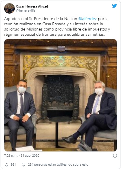 Este lunes en Casa Rosada el gobernador de Misiones, Oscar Herrera Ahuad mantuvo diálogo con el presidente de la Nación, Alberto Fernández, acerca de la solicitud para la creación de una zona franca en Misiones con el objetivo de contar con un sistema impositivo diferenciado debido a su situación de frontera.
