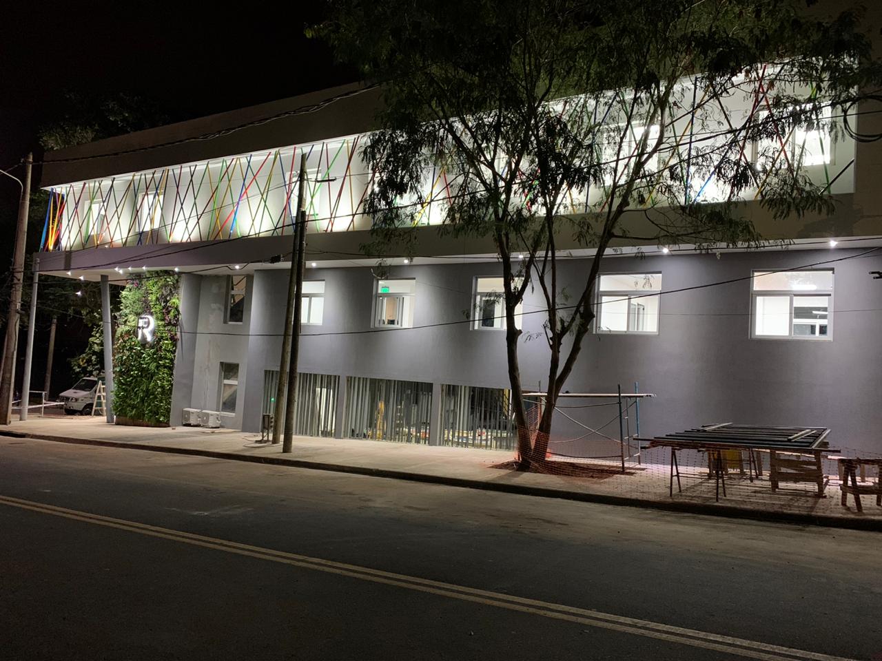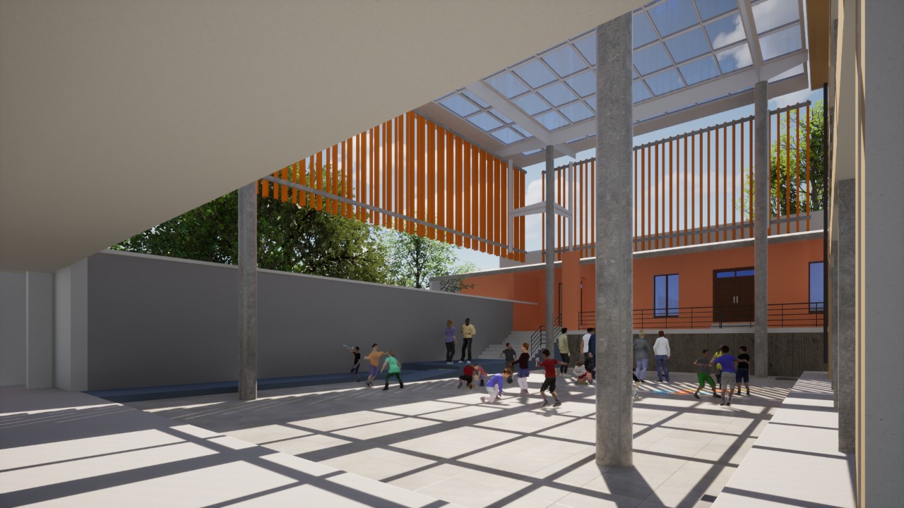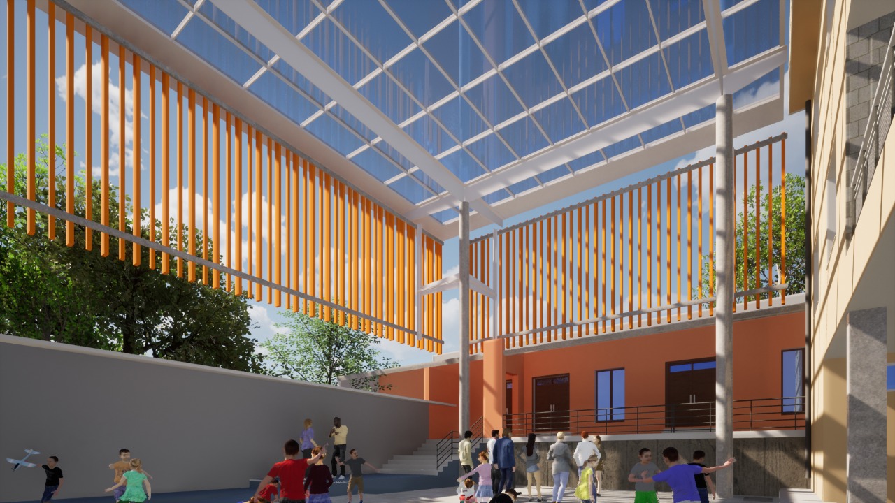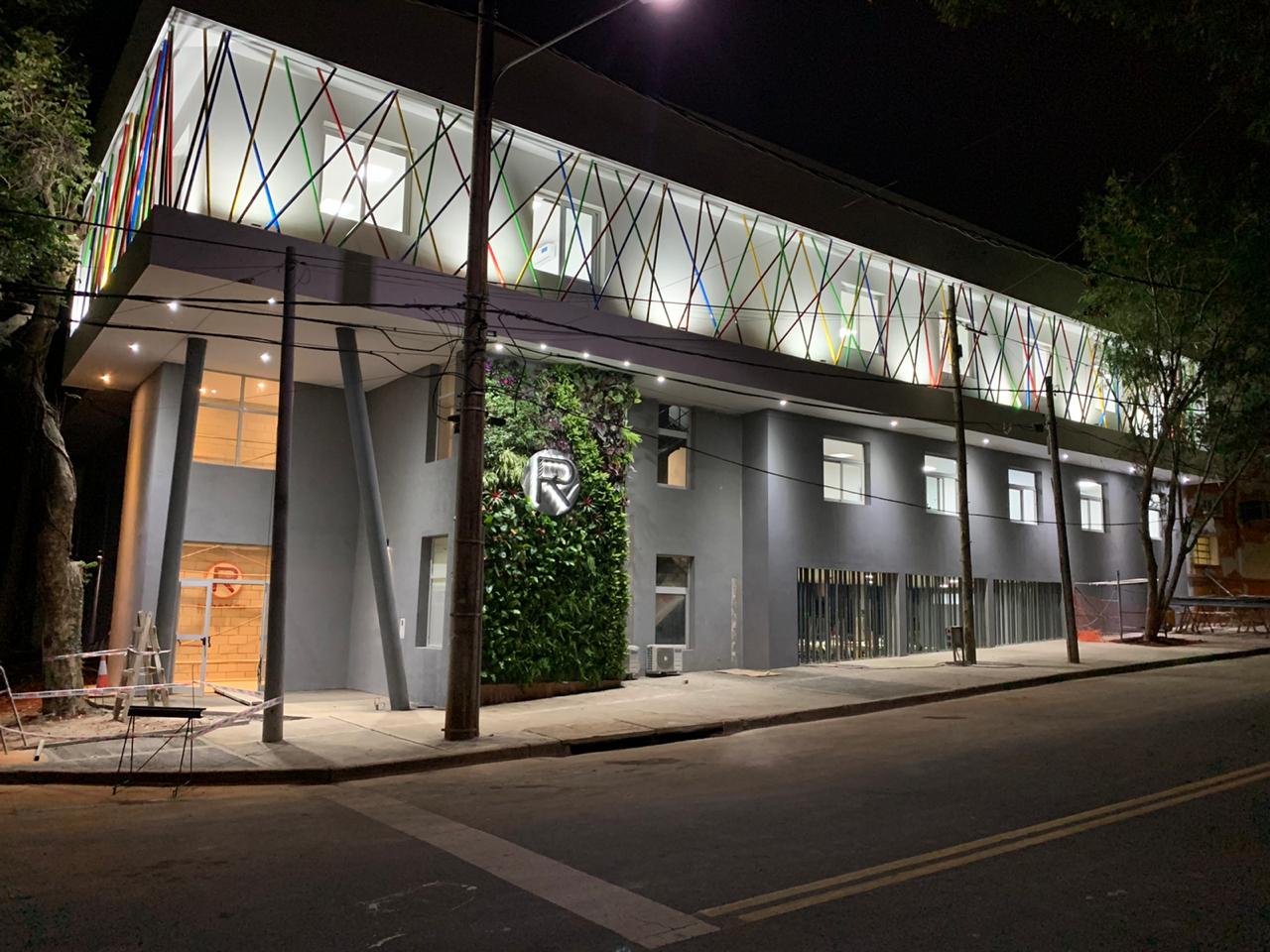 El antiguo patio de la escuela ganó una cubierta de cristal que permite el paso de luz solar y ofrece protección para las dos nuevas zonas de aulas y talleres ubicadas en los flamantes pisos nuevos que la Escuela de Robótica creció en altura. En la nueva fachada un jardín vertical natural enmarca el isotipo de la Escuela de Robótica.