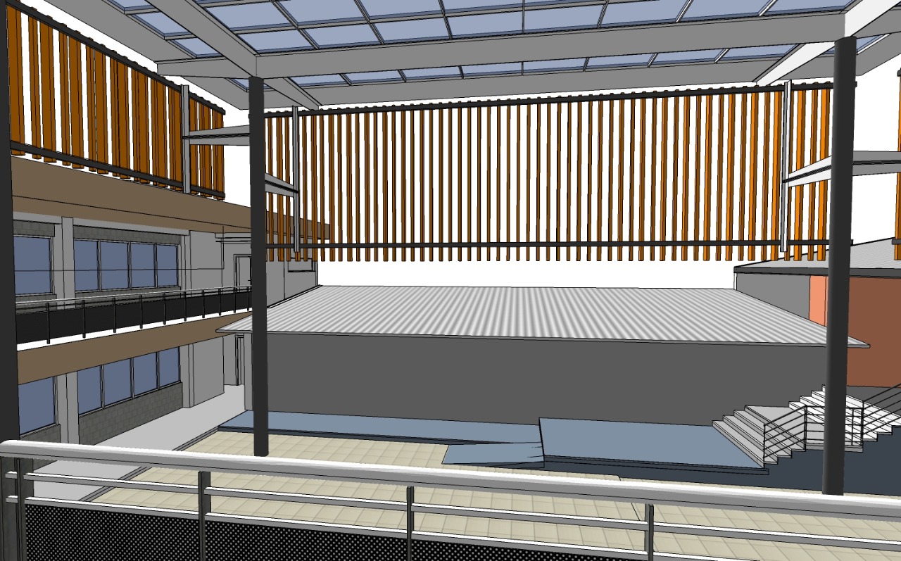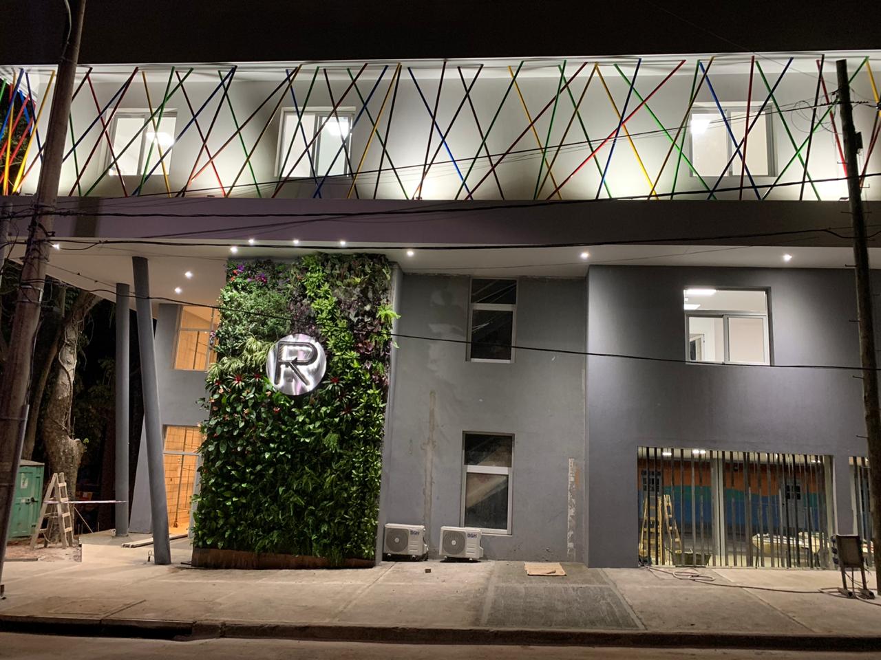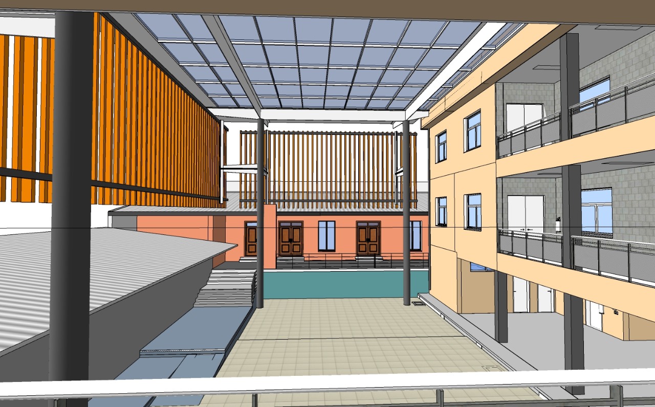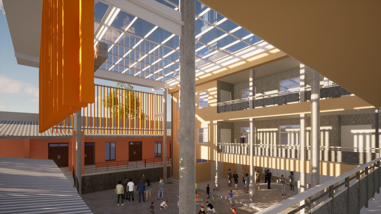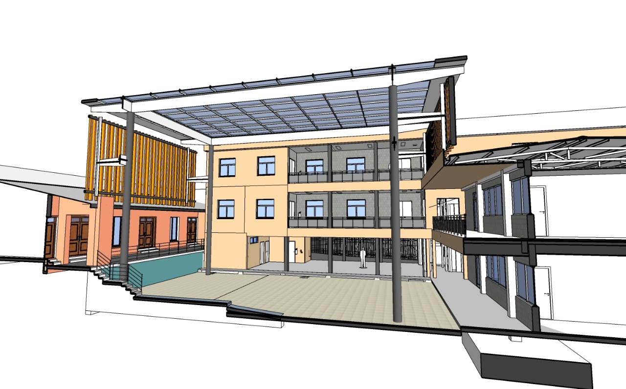 El antiguo patio de la escuela ganó una cubierta de cristal que permite el paso de luz solar y ofrece protección para las dos nuevas zonas de aulas y talleres ubicadas en los flamantes pisos nuevos que la Escuela de Robótica creció en altura. En la nueva fachada un jardín vertical natural enmarca el isotipo de la Escuela de Robótica.