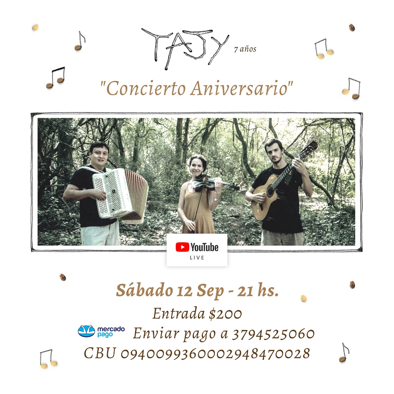 El trío correntino cumple siete años con la música y lo celebra con un concierto virtual el próximo sábado 12 de septiembre a las 21 Hs por su canal Tajy Oficial en Youtube. El valor de la entrada es de 200$ y se puede adquirir a través de Mercado Pago o por transferencia.