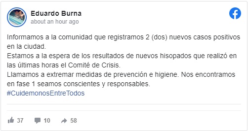 El intendente Eduardo Burna informó a la comunidad que confirmación de dos nuevos casos de coronavirus COVID-19.