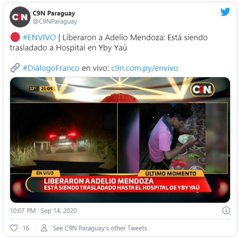 Eran pasadas las 22hs. de ayer cuando en vivo el medio de prensa paraguayo C9N Paraguay informó en su cuenta de Twiter que Adelio fue liberado y estaba siendo trasladado a un hospital en Yby Yaú (ciudad paraguaya situada en la zona oriental del departamento de Concepción, a 367 km de Asunción).