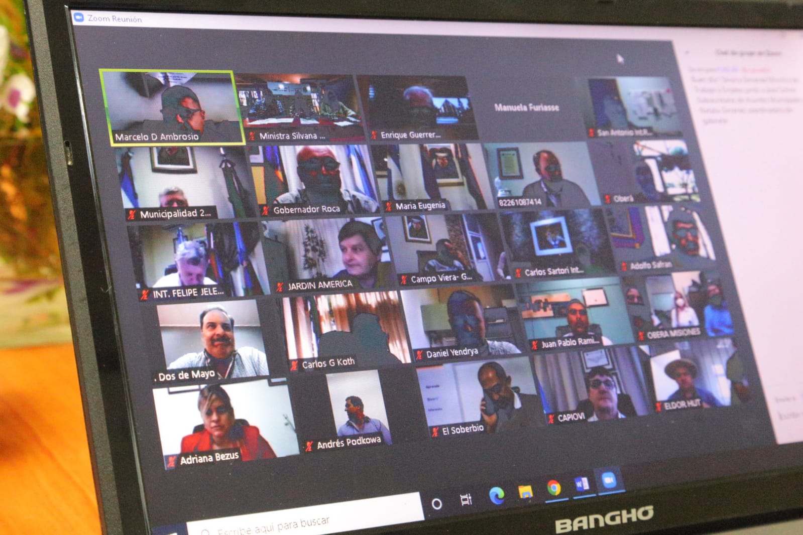 El encuentro virtual contó con la participación de la Ministra de Trabajo, Silvana Giménez; el Ministro de Hacienda, Adolfo Safrán; el Subsecretario de Asuntos Municipales, José Schiro; el Gerente General del FONCAP, Mateo Bartolini; la Coordinadora de gabinete de la cartera laboral, Natalia Giménez; la Diputada Provincial, Adriana Bezus; como también los jefes y jefas comunales de 42 localidades de la provincia.