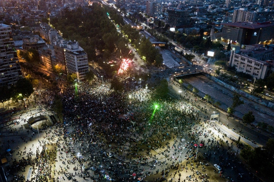 Miles de chilenos llegaron de distintos sectores para festejar en la tradicional Plaza Italia, en el centro de la capital del país, el contundente triunfo de la opción que permite iniciar el proceso para cambiar definitivamente la constitución del dictador Augusto Pinochet, que rige en Chile desde 1980.