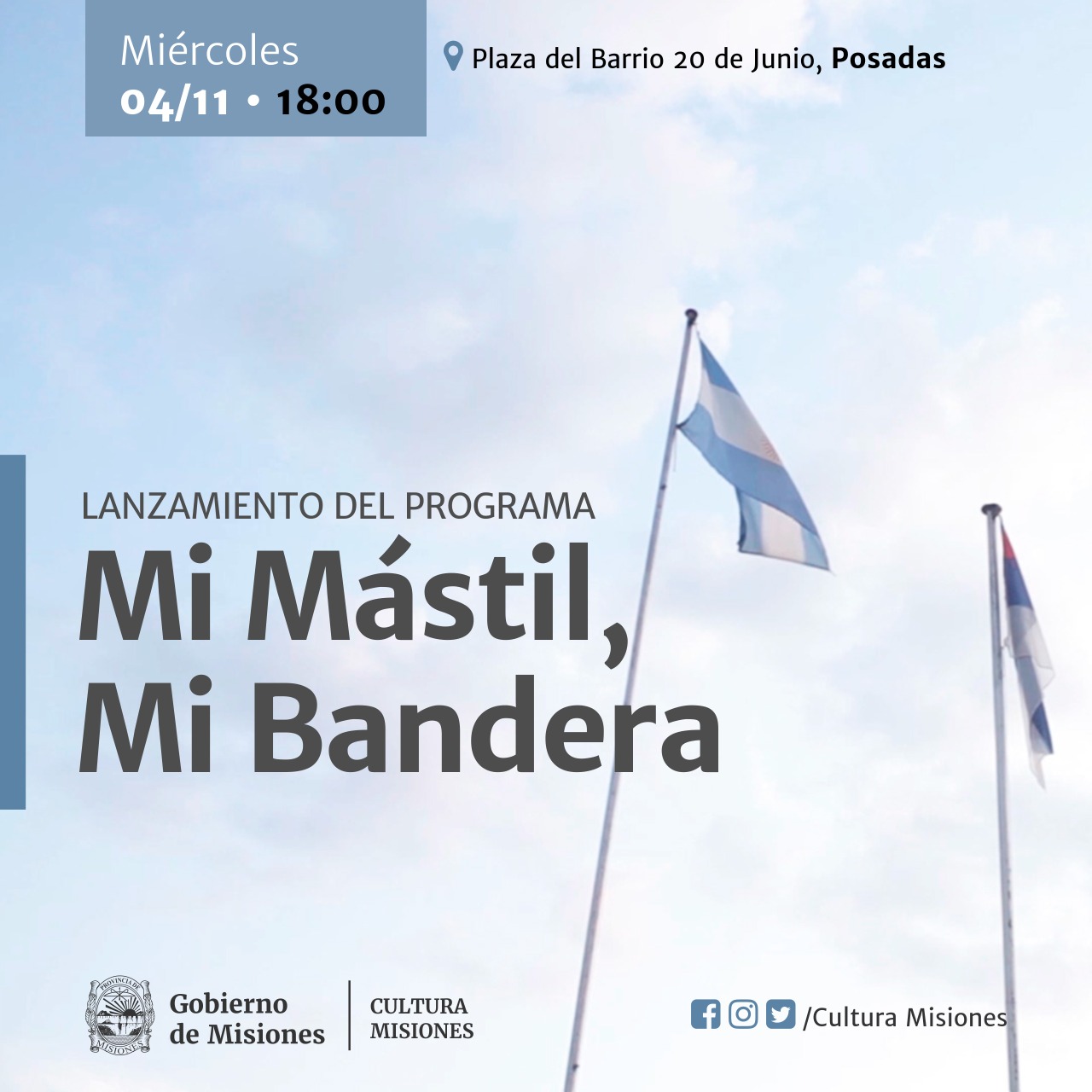 El miércoles 4 de octubre a las 18 Hs., la plaza del Barrio 20 de Junio de la ciudad de Posadas, será epicentro del lanzamiento oficial del programa “Mi mástil, mi bandera”, propiciado por la Secretaría de Estado de Cultura de la Provincia de Misiones, en articulación con la Asociación Civil Barrios Unidos El Brete. Se trata de un proyecto que tiene como finalidad la recuperación de los mástiles que se encuentran en las plazas de barrios y pueblos misioneros, a partir de su puesta en valor tanto material como simbólicamente.