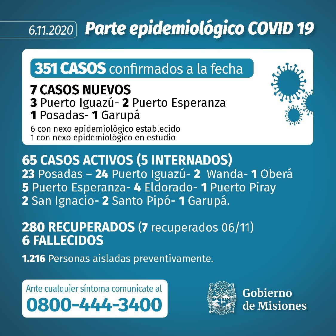 De los 351 casos 65 permanecen activos, 5 de ellos en internación. Además se informó que 7 personas se recuperaron y 1216 personas permanecen en aislamiento domiciliario.