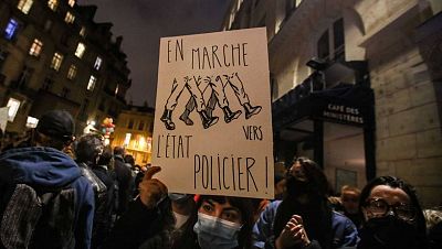 “Policía en todas partes, justicia en ninguna parte”, “Estado policial” y “sonríe mientras te golpean” eran algunos de los lemas más coreados en la manifestación parisina, que se desarrolló principalmente de manera pacífica.