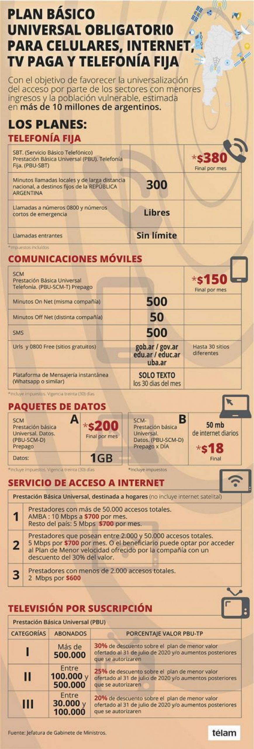 En el caso de la telefonía móvil tendrá un precio de $150 bajo el sistema prepago, mientras que en la telefonía fija será de $380 por mes. La prestación se implementará desde el 1 de enero
