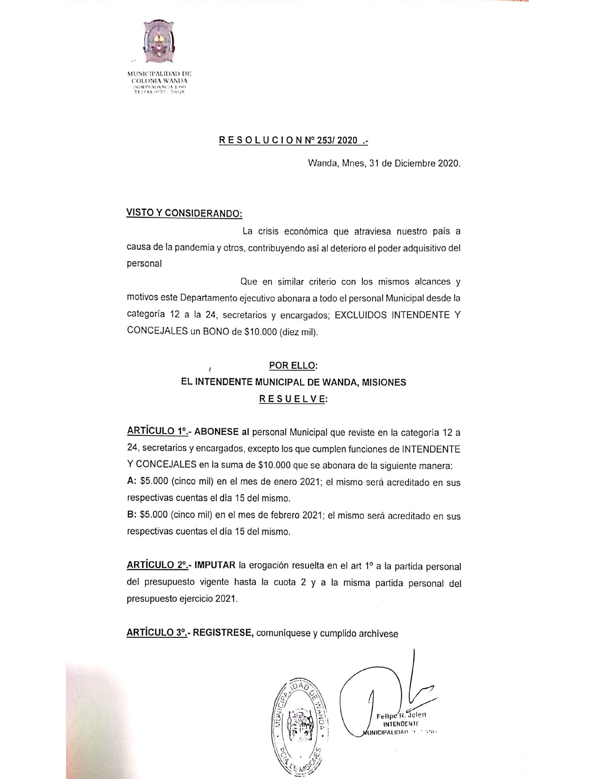 El intendente de Colonia Wanda, Felipe Jeleñ, dispuso de un bono de $10.000 que se abonará en dos partes iguales de $5.000, la primera el 15 de enero y la segundo cuota el 15 de febrero, beneficio que alcanza a todo el personal del ámbito municipal exceptuando al jefe comunal y a los concejales