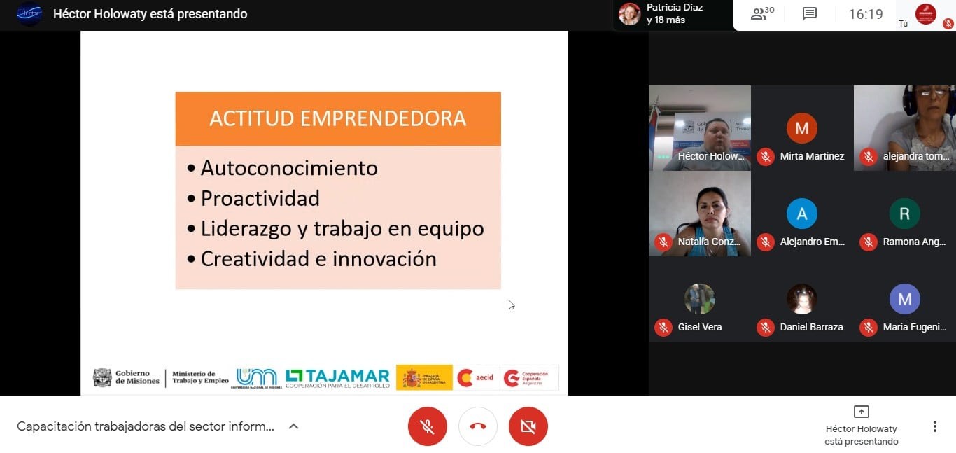 Este jueves se llevó a cabo el último encuentro del taller online “Aprender a Emprender”, en el marco del proyecto Fortalecimiento de trabajadoras de la economía social y solidaria, realizado por el Ministerio de Trabajo y Empleo de Misiones, Ministerio de Salud, AECID (Agencia Española de Cooperación Internacional para el Desarrollo), Fundación Tajamar y la Universidad Nacional de Misiones.