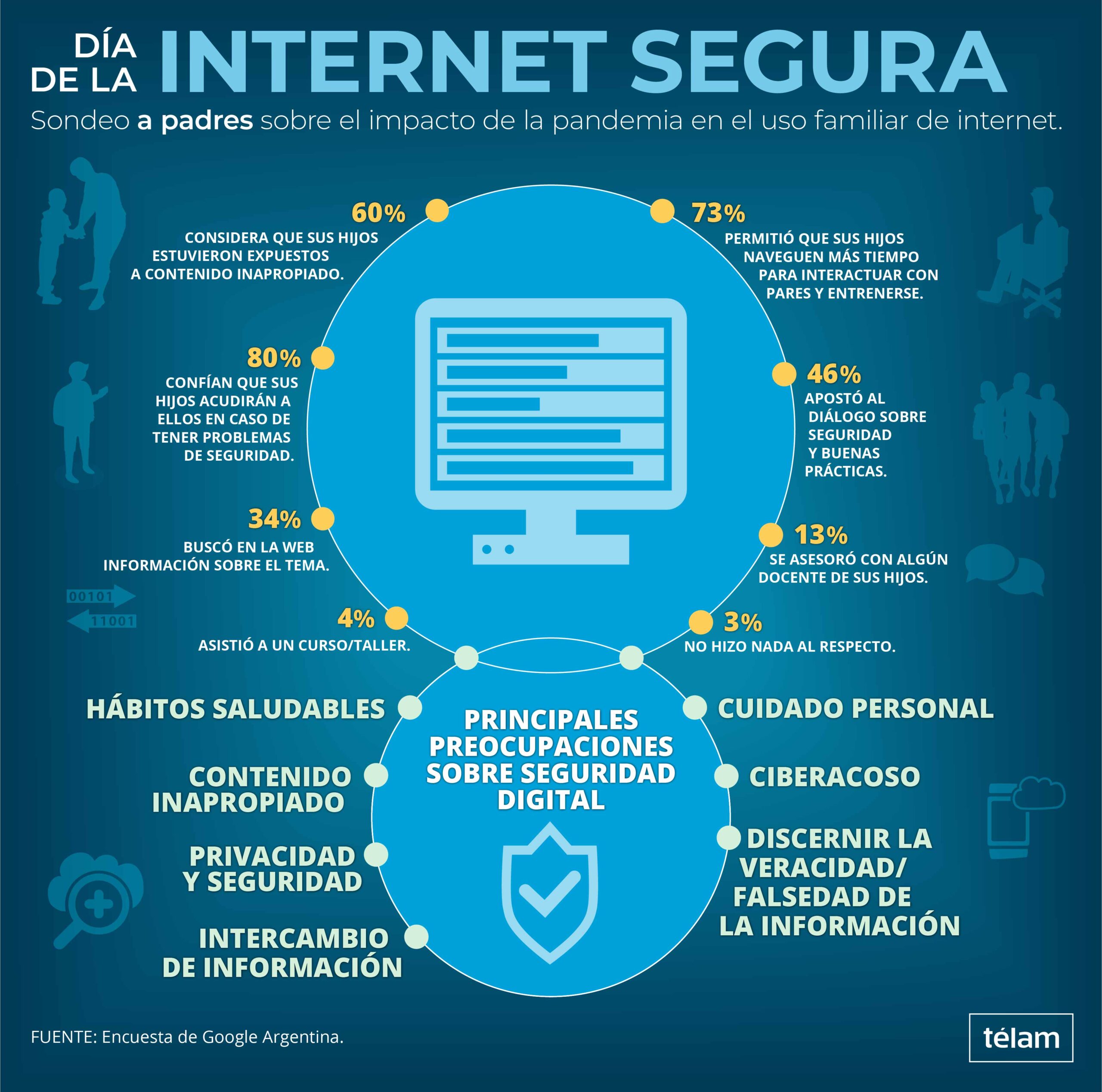 Seis de cada diez padres consideran que sus hijos estuvieron expuestos a contenido inapropiado en Internet durante el año pasado, un período en el que debieron permitirles pasar más tiempo frente a las pantallas debido a la virtualidad que se impuso por la pandemia de coronavirus, según un informe difundido ayer por Google en el Día Internacional por una Internet Segura.