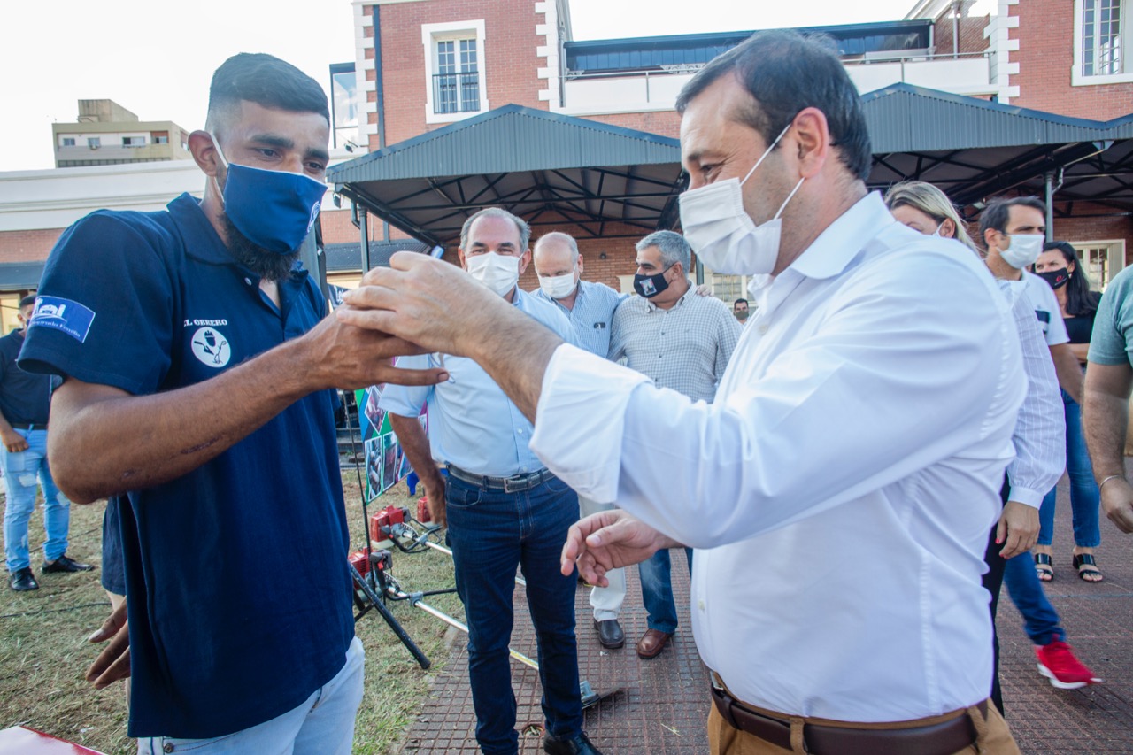 En la tarde del viernes, en el cuarto tramo de la costanera, el gobernador Oscar Herrera Ahuad, acompañado por el delegado del Ministerio de Desarrollo Social de Nación, Rolando Roa, entregó equipamiento a 9 de los 17 ganadores misioneros del concurso nacional Potenciar Joven. En la ocasión, el mandatario recorrió los stands de los jóvenes emprendedores montados a la altura de la Ex Estación de Trenes, para interiorizarse sobre sus proyectos y trabajos. Resaltó que los premios entregados son un reconocimiento “al esfuerzo y a la dedicación de los jóvenes. Es fundamental porque en ellos esta esa energía y esa potencia transformadora que necesita gran parte de la sociedad en un tiempo muy difícil, donde se ve a los jóvenes tomar la iniciativa”.