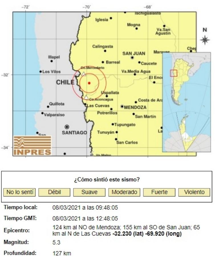 Un fuerte temblor se sintió esta mañana en Mendoza, a las 9.48 h., y según los primeros datos del Inpres (Instituto Nacional de Prevención Sísmica) el sismo tuvo una magnitud de 5.2 puntos en el Escala de Richter y se localizó a 127 kilómetros de profundidad, en la provincia de San Juan.