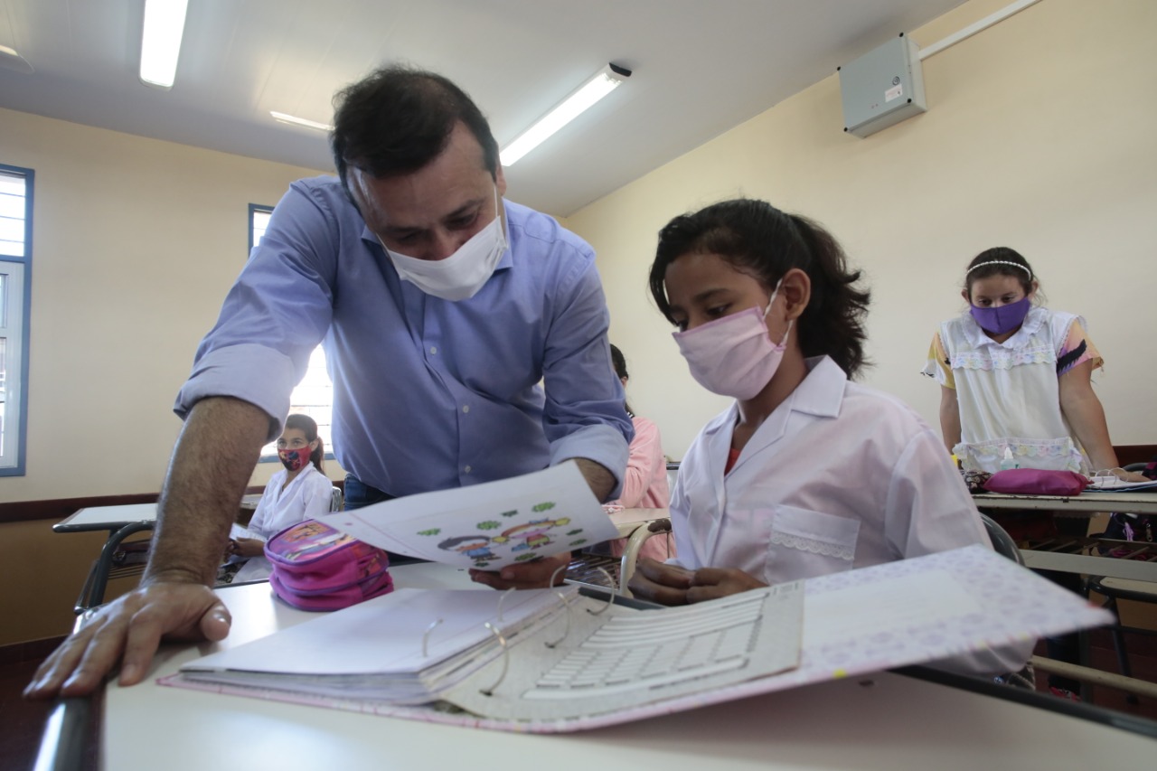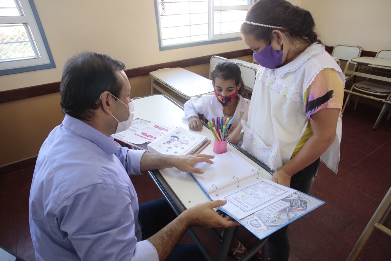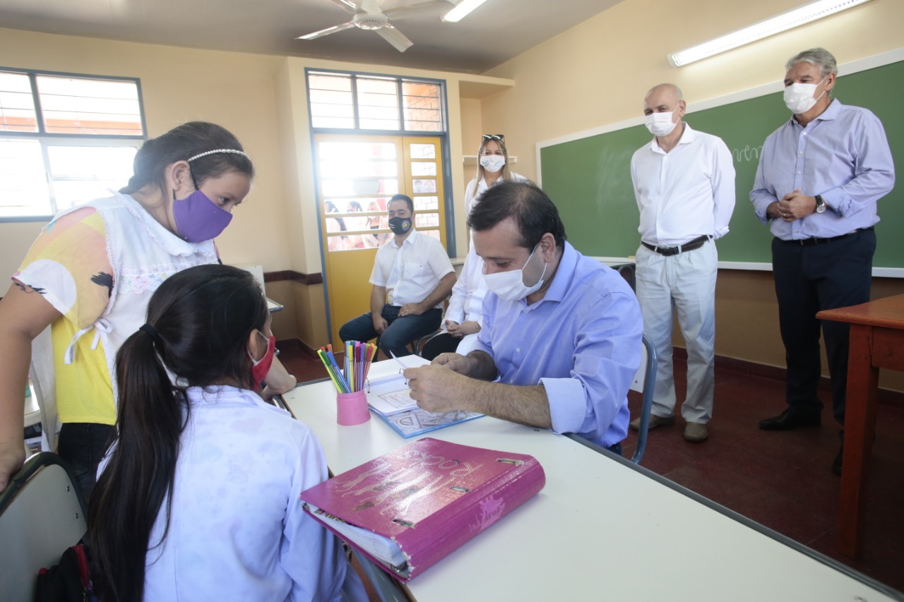 La mañana no sólo fue un acto protocolar más para el Gobernador, junto a los estudiantes Franco, Saira, Anahí y Celeste realizó el corte de cintas y el descubrimiento de la placa conmemorativa, dando inicio oficialmente al regreso a clases en esa escuela misionera. Luego recorrió las aulas y las instalaciones en compañía de la directora María Estela Robledo, con quien se interiorizó sobre la planificación y las expectativas cifradas para el nuevo año tanto para los docentes como para los alumnos. Vinculándose también directamente con los alumnos, el Gobernador conversó con estudiantes del tercer grado, en modalidad reducida, e intercambiaron impresiones sobre las temáticas y los trabajos que están realizando a la vuelta de la cuarentena. Los niños expectantes mostraron sus tareas y trabajos a Herrera Ahuad, quien se mostró muy interesado por su realidad familiar y su aprendizaje en el día a día.