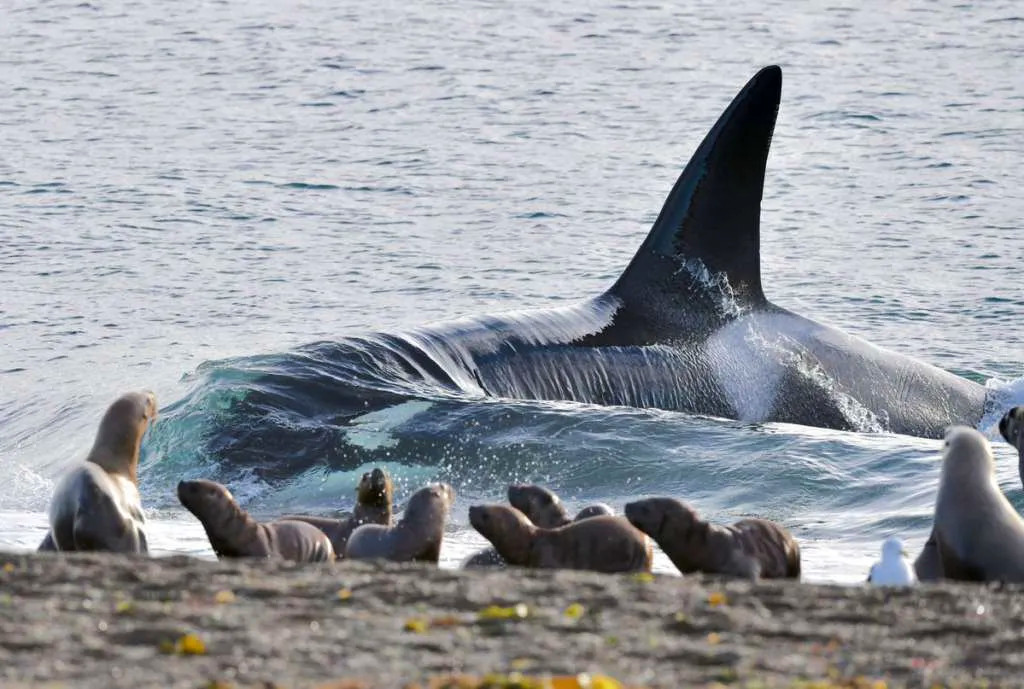 Este tipo de orcas es conocido por su particular método de caza para alimentarse, que consiste en el encallamiento deliberado sobre la playa para capturar crías de lobos y elefantes marinos.