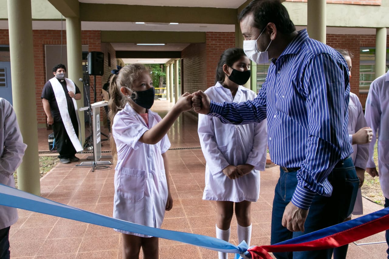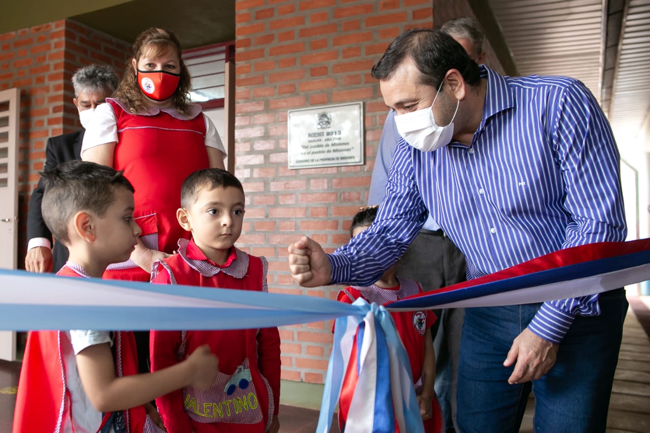 El gobernador Oscar Herrera Ahuad encabezó ayer la inauguración de las obras de ampliación de dos escuelas y un NENI de Garupá, acompañado por el intendente Luis Ripoll. Puso en marcha ampliaciones en la Escuela N°59 “Juana Azurduy”, el NENI Nº 2013 y la Escuela Nº 763. Así, en su jornada de trabajo, el mandatario reforzó su compromiso con el sistema educativo acompañando a las comunidades escolares en su regreso a clases, respetando los protocolos vigentes y el esquema bimodal de cursado.