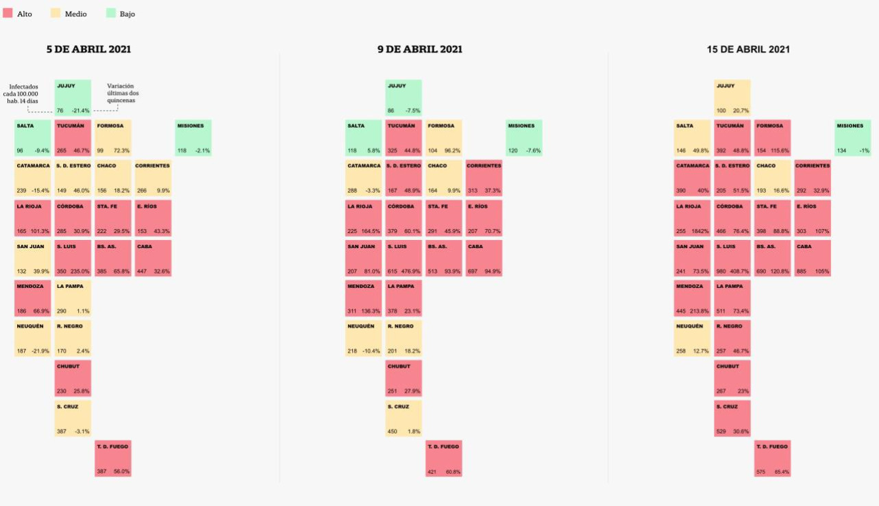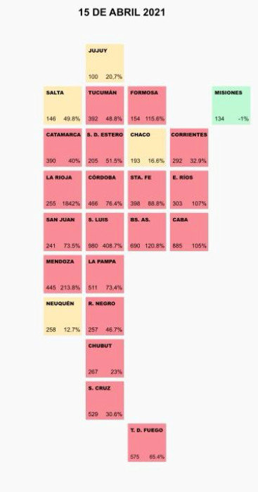 Tucumán, Formosa, Catamarca, Santiago del Estero, Corrientes, La Rioja, Córdoba, Santa Fe, Entre Ríos, San Juan, San Luis, Buenos Aires, Ciudad de Buenos Aires, Mendoza, La Pampa, Rio Negro, Chubut, Santa Cruz y Tierra del Fuego superan el 20% de variación de casos entre las últimas dos quincenas y la tasa de infectados de los últimos 15 días excede los 150 casos por cada 100 mil habitantes.