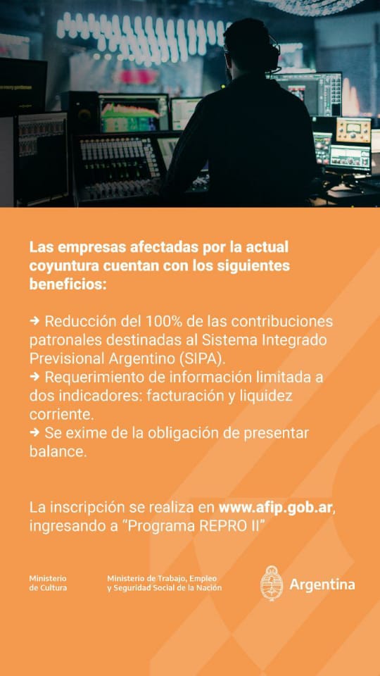 “Esta medida se enmarca en el conjunto de programas de acompañamiento y apoyo a empresas que se vieron afectadas por emergencia sanitarias y sus consecuencias directas, como la interrupción de actividades o la realización de la misma con aforos reducidos. Son más de 770 empresas y 8000 trabajadores y trabajadoras alcanzados por este programa” señalaron desde Cultura Nación.