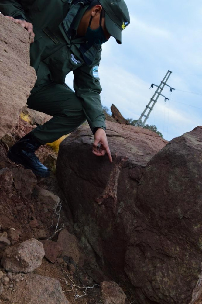 Los efectivos del Escuadrón Seguridad “El Chocón” mientras efectuaban un patrullaje a pie por la zona lindera al perímetro de la dicha Unidad, observaron a simple vista que de una de las rocas sobresalía un trozo de hueso semi quebrado e incrustado dentro de la piedra.