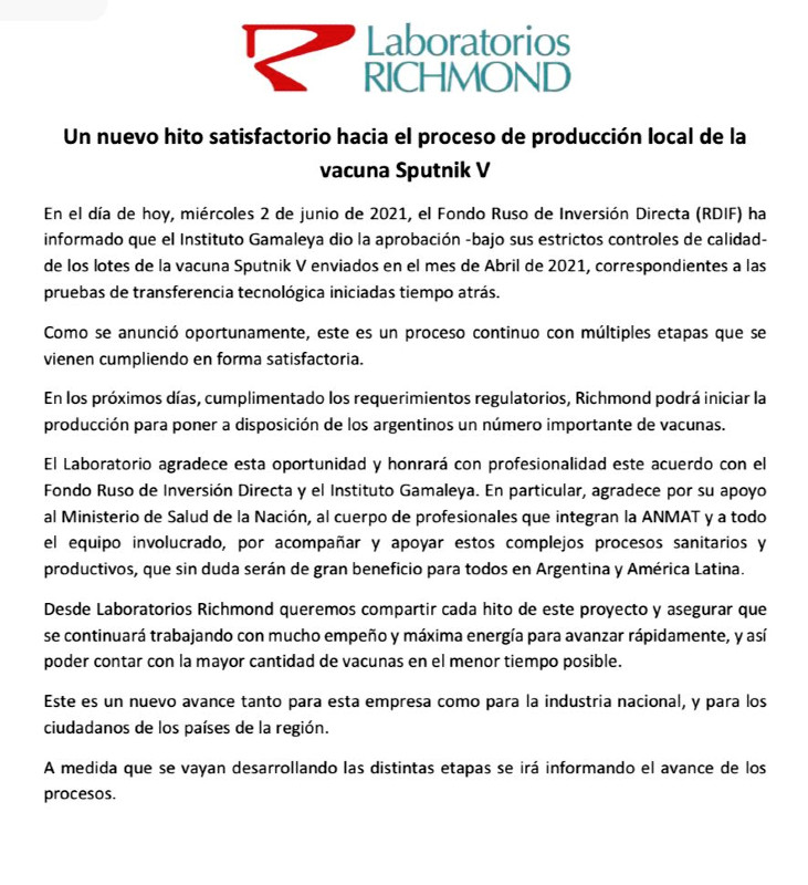 Richmond consignó en un comunicado que el Instituto Gamaleya “dio la aprobación, bajo sus estrictos controles de calidad, de los lotes de la vacuna Sputnik V enviados en el mes de abril de 2021, correspondientes a las pruebas de transferencia tecnológica iniciadas tiempo atrás”.
