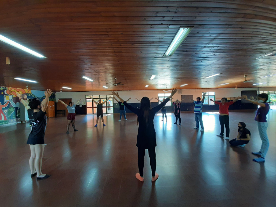 En el mismo establecimiento escolar, el domingo tuvo lugar el taller “Danza: hacia lo comunitario”, coordinado por la bailarina y coreógrafa Mónica Revinski. Aquí, el trabajo surge de un concepto novedoso en materia de talleres de danza y expresión corporal en la provincia, que irrumpe a partir de una investigación de Aurelia Chillemi bailarina, psicóloga y profesora de la Universidad Nacional de las Artes de Buenos Aires, que fuera maestra de Revinski. “Como sucede con el teatro comunitario, la danza comunitaria abre un espacio y tiempo para el encuentro, y la propuesta artística gira en torno a la realidad concreta de ese grupo como comunidad. Esto también viene a romper con el preconcepto de que la danza es solo para gente que empezó a estudiar de muy pequeña, que es solo para virtuosos, sino que empieza a aparecer la danza como un derecho del ser humano y se contempla que la danza puede ser una herramienta de inclusión social y para la salud personal, y que se vincula con valores que tienen que ver con una sociedad mejor” explicó la tallerista.