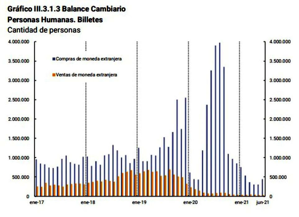 A pesar de que junio mostró un aumento en la cantidad de compradores, todavía la cifra sigue siendo baja en comparación con los meses previos al recrudecimiento del cepo que se estableció el 15 de septiembre de 2020. Un año atrás, en julio de 2020, casi cuatro millones de personas compraron la divisa. En comparación, en junio -último dato disponible- 443.000 individuos compraron dólares, unos 139.000 más frente a mayo.