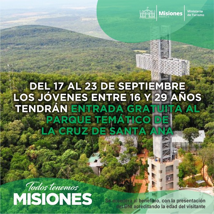 Es por eso que, desde el viernes 17 de septiembre hasta el jueves 23 inclusive, los jóvenes de entre 16 y 29 años podrán ingresar a todos los Parques Provinciales de la provincia sin abonar el ingreso, lo que constituye una excelente oportunidad para conocer o redescubrir la gran diversidad natural que ofrece Misiones. Para acceder al beneficio, los visitantes deberán presentar su Documento Nacional de Identidad en la boletería de cada predio.