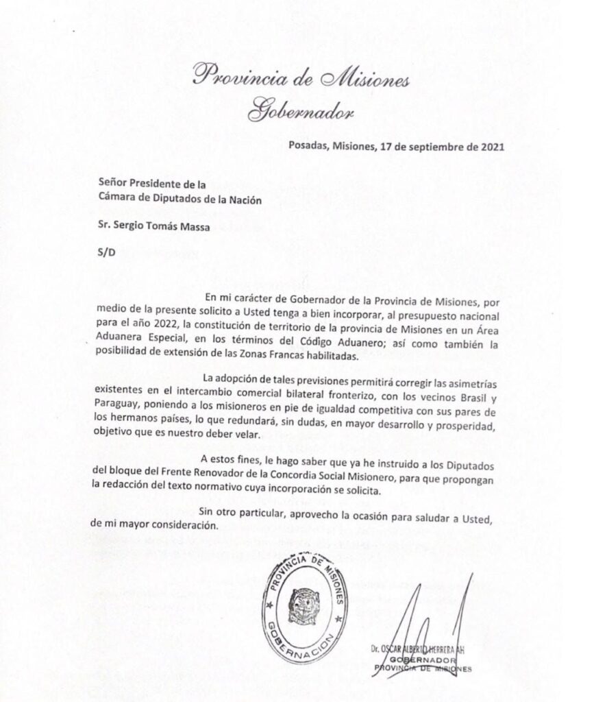 Cabe recordar que en una misiva del 17 de septiembre, el Gobernador Oscar Herrera Ahuad remitió al Presidente de la Cámara de Diputados de la Nación, Sergio Massa el pedido de inclusión, para su tratamiento, de la constitución de Misiones en Zona Aduanera Especial, como así también la extensión de las zonas francas habilitadas.