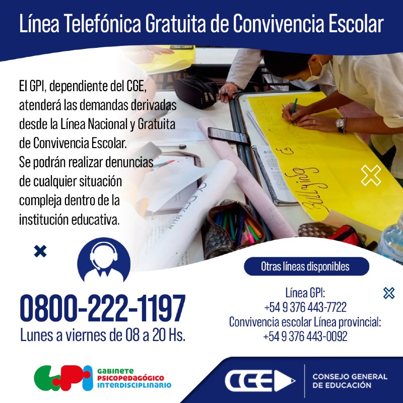 El Gabinete Psicopedagógico Interdisciplinario del C.G.E. de Misiones comunica la incorporación del área de trabajo “Convivencia Escolar”, en el marco de acciones conjuntas con la “Línea Telefónica Gratuita de Convivencia Escolar” de la Secretaría del Ministerio de Educación de la Nación, y en acuerdo con el Consejo Federal de Educación, garantizando de este modo la implementación de la Ley 26.892/13 “Para la promoción de la convivencia y el abordaje de la conflictividad social en las instituciones educativas” dentro del territorio provincial.