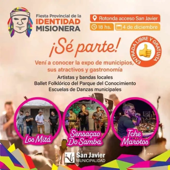 La primera Fiesta de la Identidad Misionera se realizará el sábado venidero en San Javier, en el sureste de Misiones, con una feria de promoción turística de 25 municipios y espectáculos de artistas de toda la provincia, informaron hoy desde el Ministerio de Turismo local.