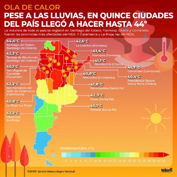 A las 17, los datos del SMN indicaron que soportaban intensos calores Santiago del Estero con 44.4, Las Lomitas en Formosa 42.6, Termas de Río Hondo 42.3, Ceres en Santa Fe, y Chamical en La Rioja 42.2.